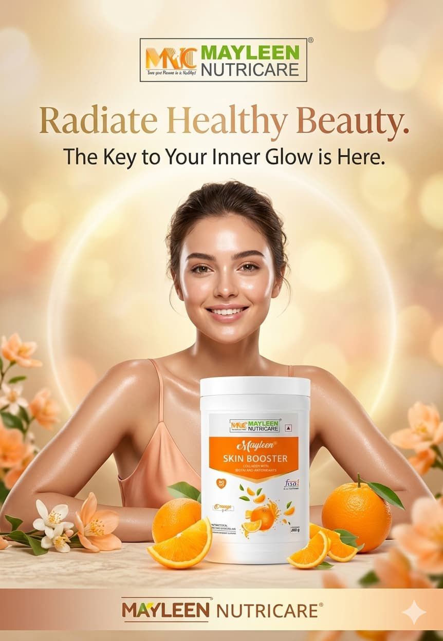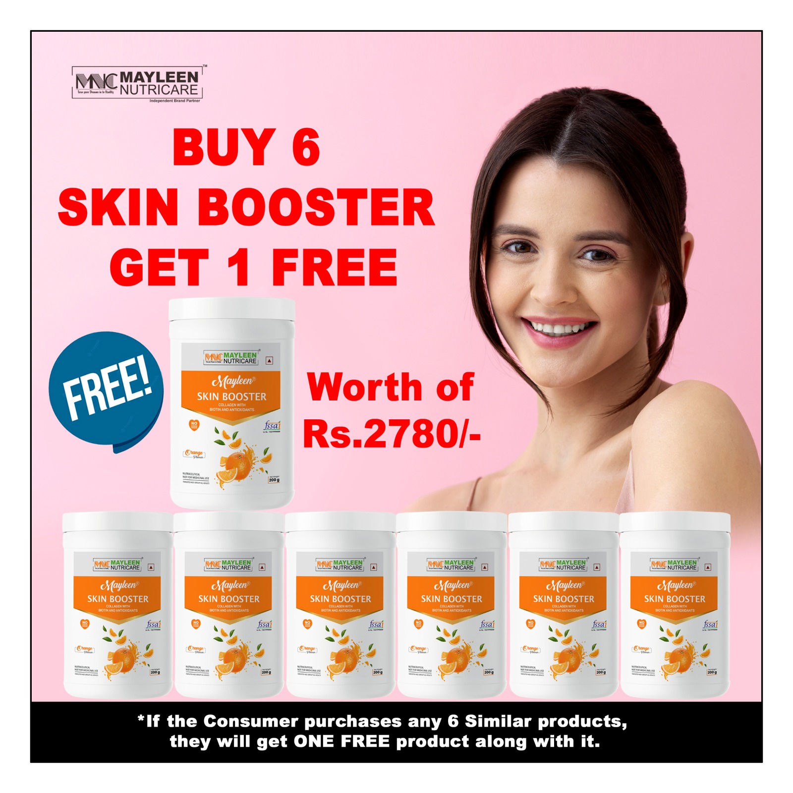यह इमेज Nutricare Skin Booster का है, जिसमें “Buy 6 Get 1 Free” ऑफर दिख रहा है। यह एक स्किन हेल्थ सप्लीमेंट (Collagen Skin Booster) है।